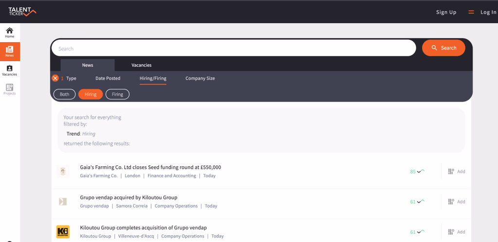 Quick Filters: The UX of these trackers was consistent with quick filters between layoffs, hiring and firing news, etc., It made for a fast UX which I wanted to adopt as well.
